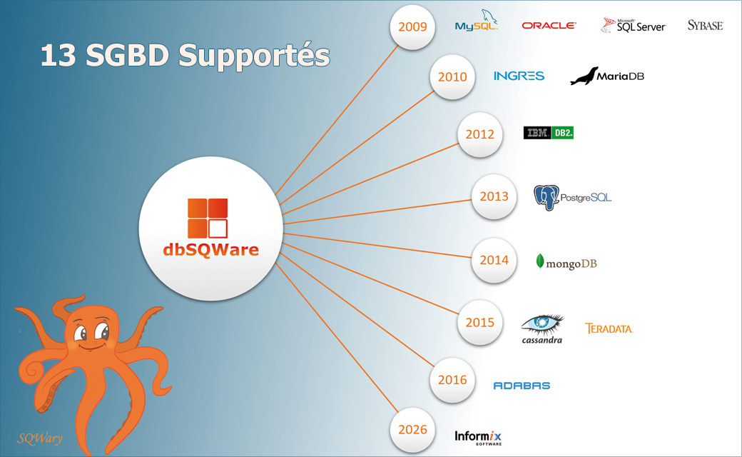 Si la 1ère version officielle de dbSQWare supportait 4 moteurs de bases de données, aujourd’hui, ce sont 13 moteurs qui sont gérés par le logiciel.